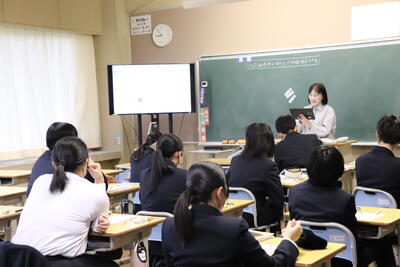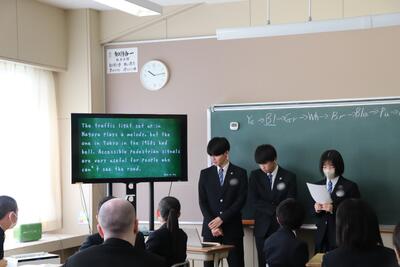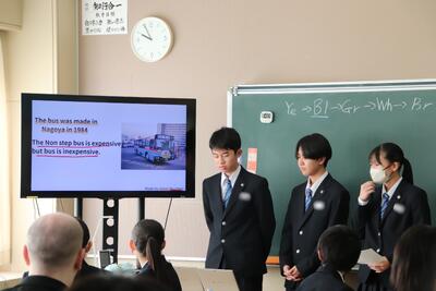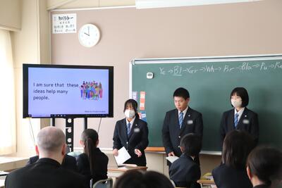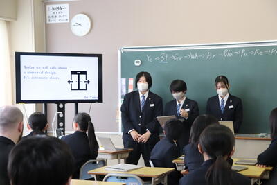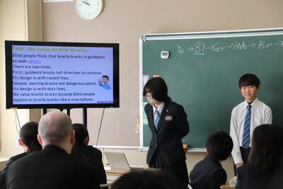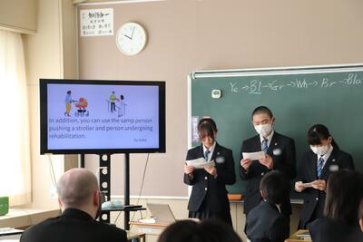 2年生の英語の授業で、「ユニバーサルデザインを伝えよう」というテーマでグループ発表を行いました。
