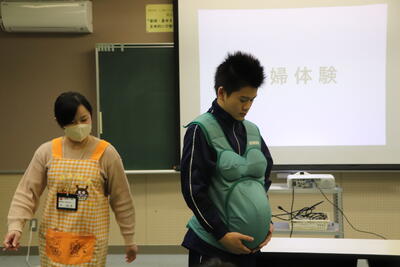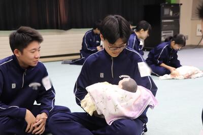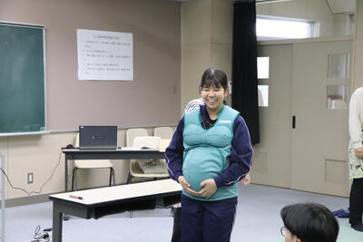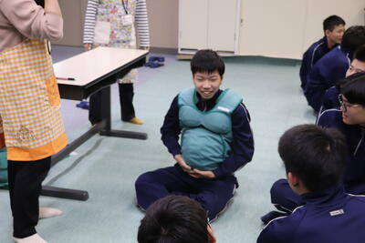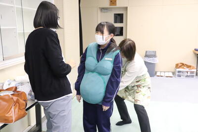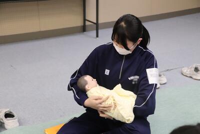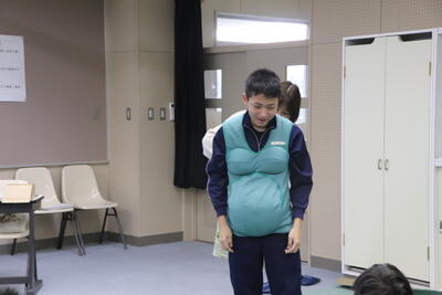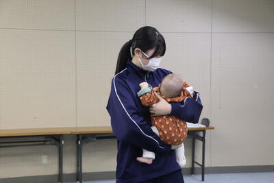はじめに保健師さんよりお話をいただき、ジャケットをつけて妊婦体験をしたり、赤ちゃんの人形でだっこの練習をしてから、本物の赤ちゃんをだっこしました。